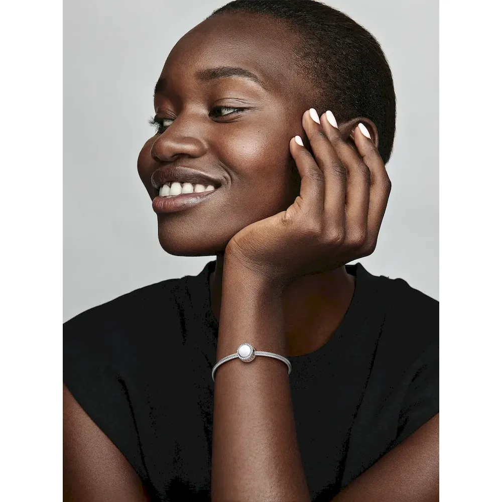 Add this simple-yet-sleek charm to your Pandora collection. This polished button charm is hand-crafted in sustainably sourced sterling silver and features 52 bead-set round brilliant-cut clear cubic zirconia stones in a delicate ring. This Pandora piece is all about self-expression: choose to keep it blank and let the symbol speak for itself or engrave the front, the back or both. Pandora Engraving is only available in select stores and markets.