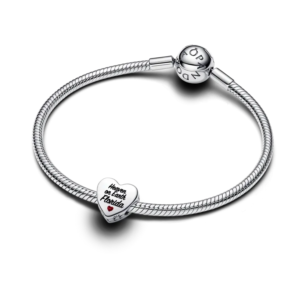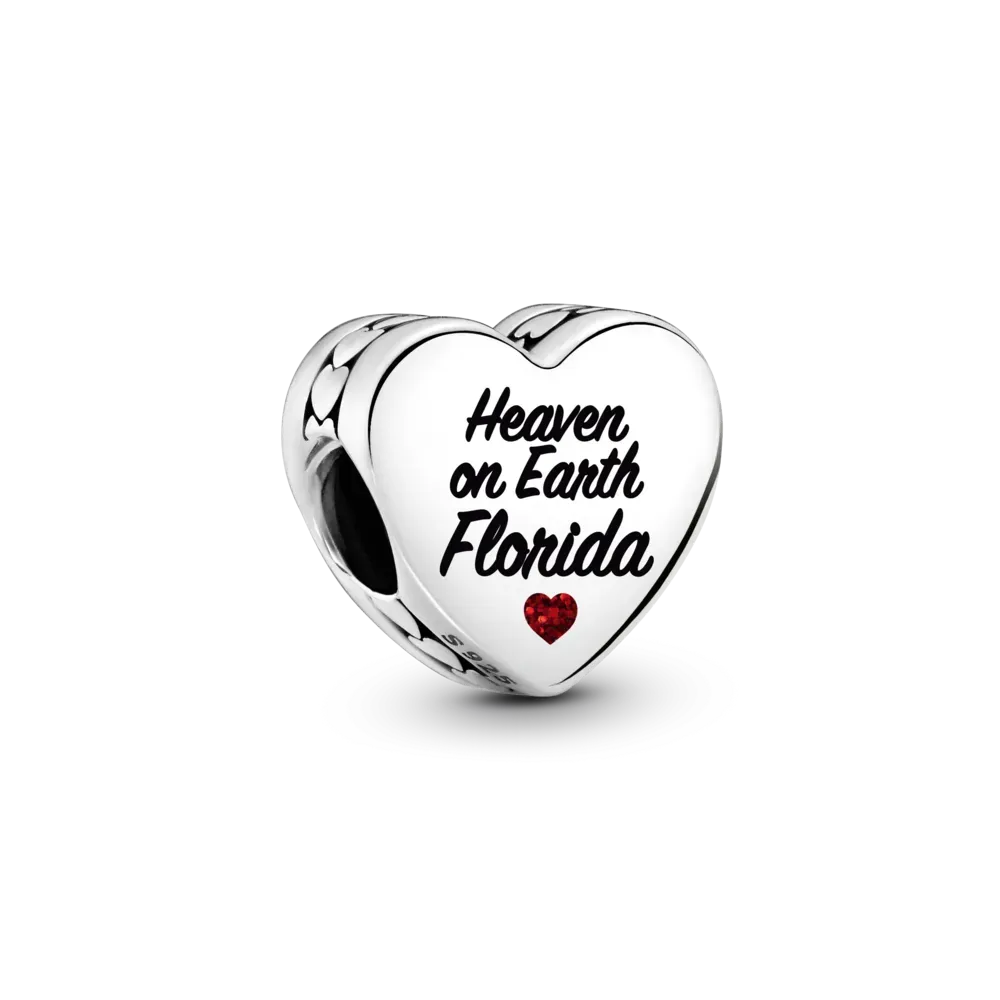 Palm trees, ocean breeze, and sunny skies. Capture the spirit of Florida’s coastal charm with this heart-shaped symbol in sterling silver. One side reveals a breathtaking beach scene, brought to life with glossy enamel in vibrant, tropical shades. On the other side features “Heaven on Earth Florida” beautifully scripted in black with a red heart underneath. It’s the perfect way to add a little piece of paradise to your collection.
