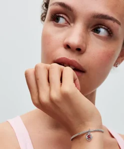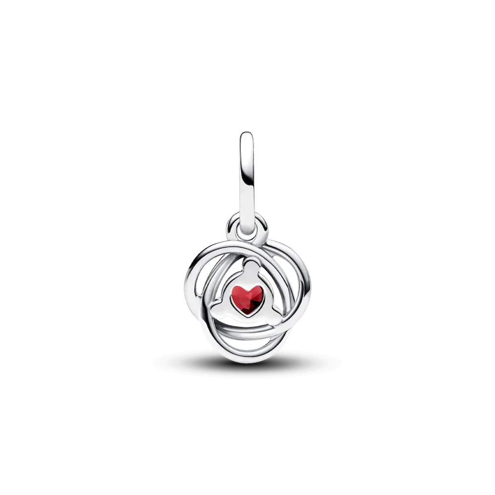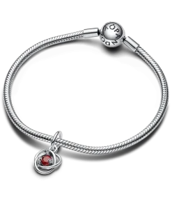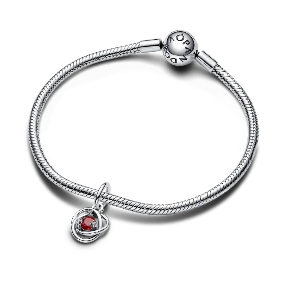 Introducing a new addition to the Eternity Circle family with our Stones of the Month dangle charms. Inspired by unconditional love and power, this intricate knot design features openwork infinity braiding around July’s fiery red man-made crystal at the center. Surrounded by three small cubic zirconia stones on the front and a cut-out heart shape on the back for maximum sparkle. This dazzling dangle charm comes on a matching sterling silver Pandora Moments Snake Chain Slider Bracelet. Capture the symbolism of a July birthday, milestone or anniversary with this bold colored set. Unconditionally. Infinitely. Be love.