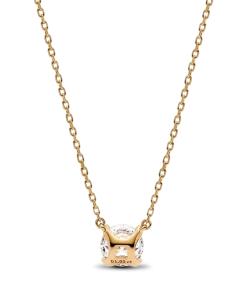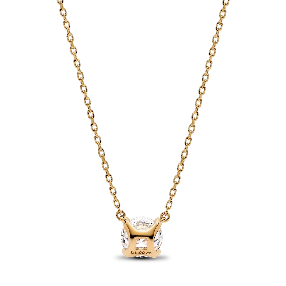A fresh twist on a classic. The Pandora Era 14k Gold Lab-grown Diamond Pendant Necklace showcases a 1.00 carat round brilliant excellent cut lab-created diamond in a four-prong setting that combines round and flat profiles, creating a modern aesthetic and opening the stone to the light for amplified sparkle. The 14k gold pendant is fixed to a matching diamond-cut cable chain, adjustable to two lengths. The matching earrings feature a 0.50 carat round brilliant excellent cut lab-grown diamond in each earring, with a total carat weight of 1.00.This lab-grown diamond gift set is a universally wearable set that will elevate your looks day and night for years to come.