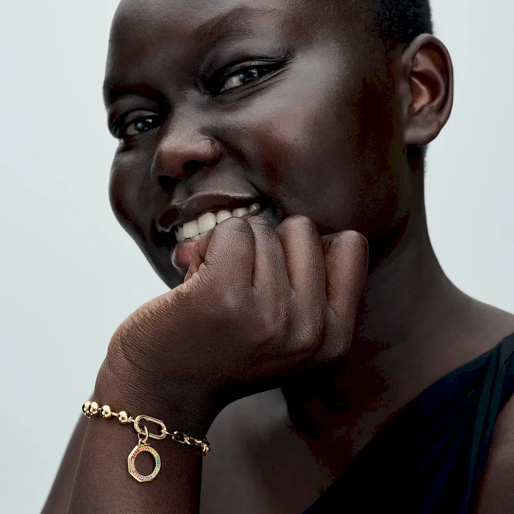 Energize your look and your vibe with the Pandora ME Rainbow Medallion Charm. Crafted in our 14k gold-plated unique metal blend, this octagon-shaped charm features a rainbow-hued row of sparkling stones in green, pink, light blue, dark blue, red, purple, orange and yellow on one side. On the other side is an engraved message that reads: