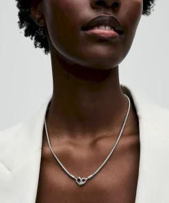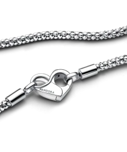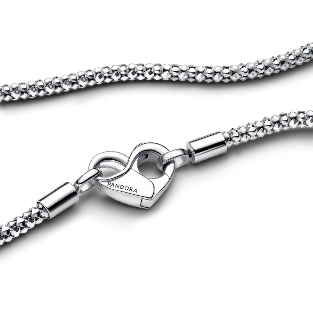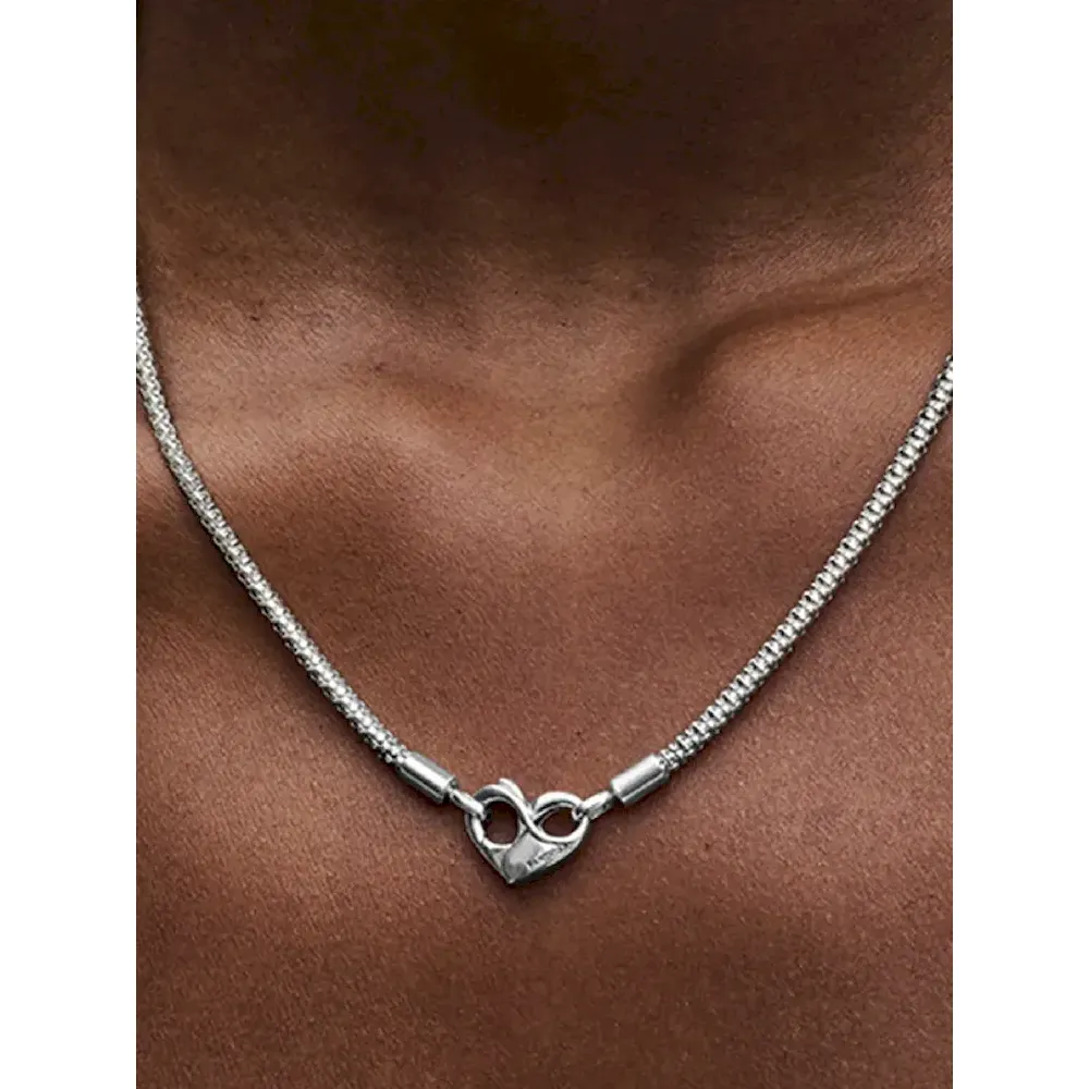 Update your collection with our Pandora Moments Studded Chain Necklace. Hand-finished in sterling silver, this necklace features a flexible, textured chain and an infinity-detailed openable heart clasp. Please note: it can be styled with any size of the Pandora Moments O Pendant or Heart Charm Pendant.
