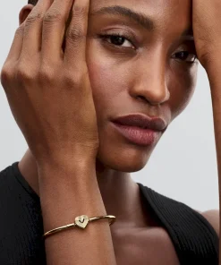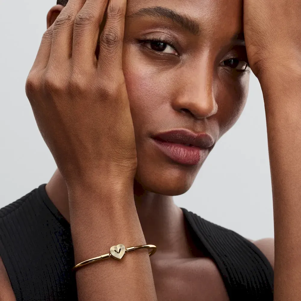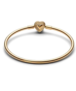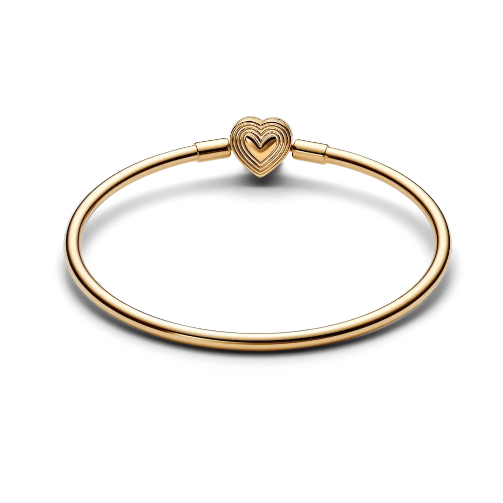 Go for sleek simplicity with the Radiating Heart Clasp Bangle. This 14k gold-plated bangle has a heart-shaped clasp with a cut-out heart on one side –a design that pays tribute to the power of love. Made to be styled with a maximum of 16 to 18 charms or dangle charms, this bangle will become a staple in any collection.