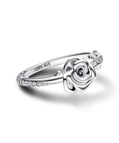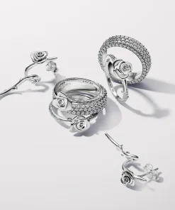 Crafted in sterling silver, the Rose in Bloom Ring represents the timeless gesture of gifting a rose to someone special. Blooming rose petals delicately layer on the ring’s surface, creating a stunning three-dimensional effect. The band, adorned with a swirling pavé row, radiates classic elegance. The raised thorns add a extra level of detail, turning a classic symbol into a unique statement. Inspired by the universally recognized symbolism of a rose, this ring captures the essence of love and makes for a great gift for someone close to your heart.