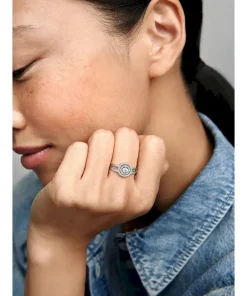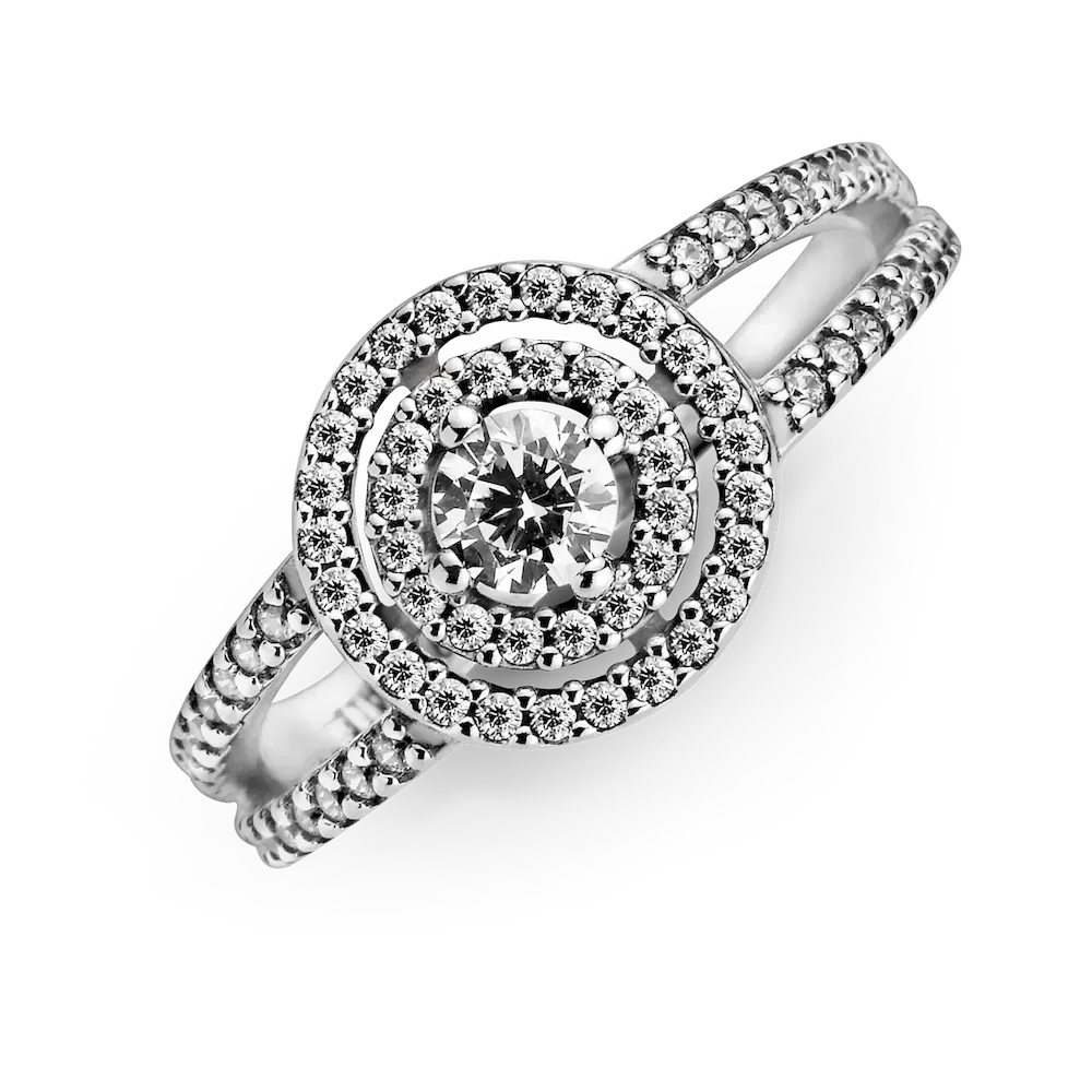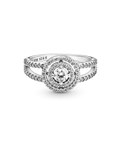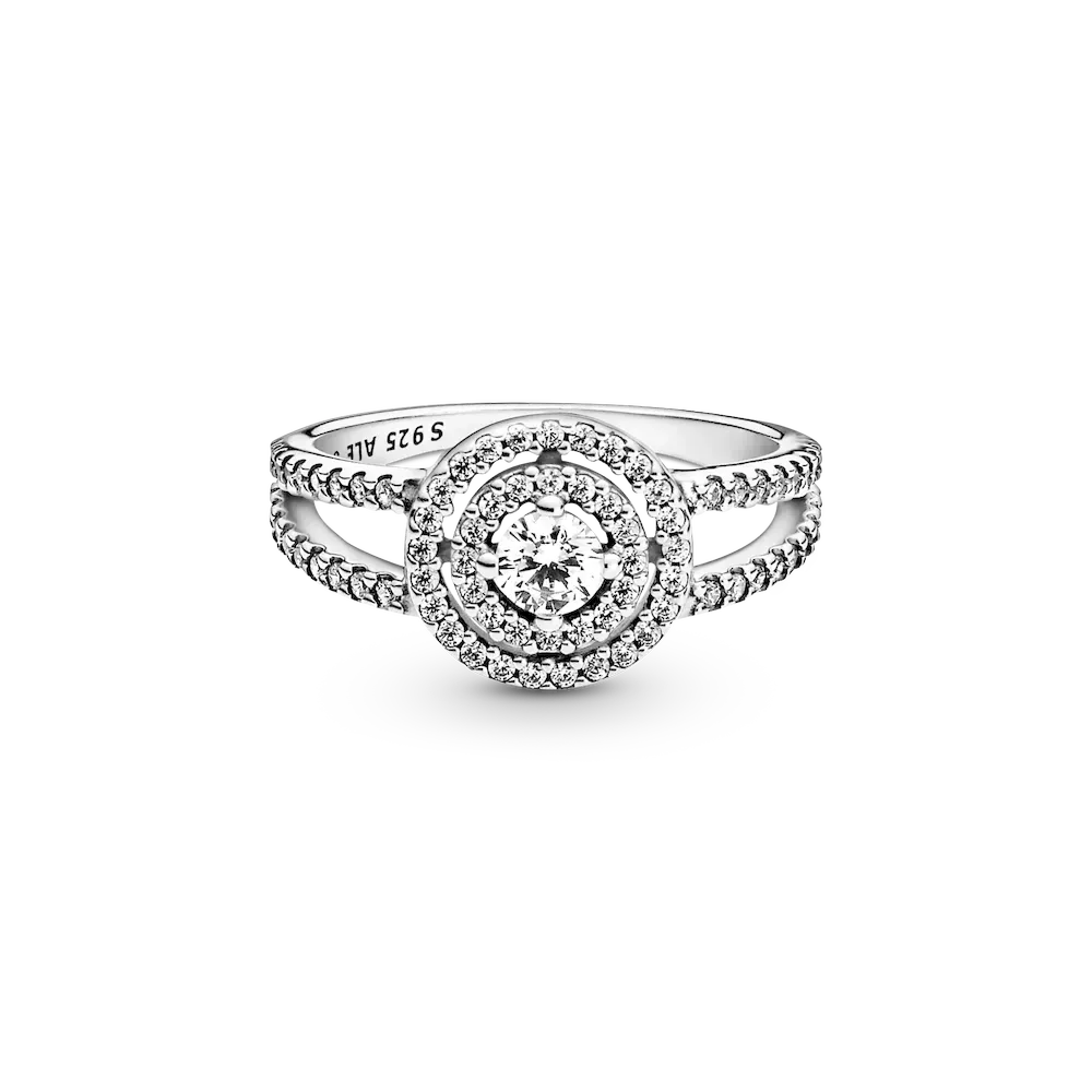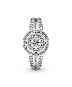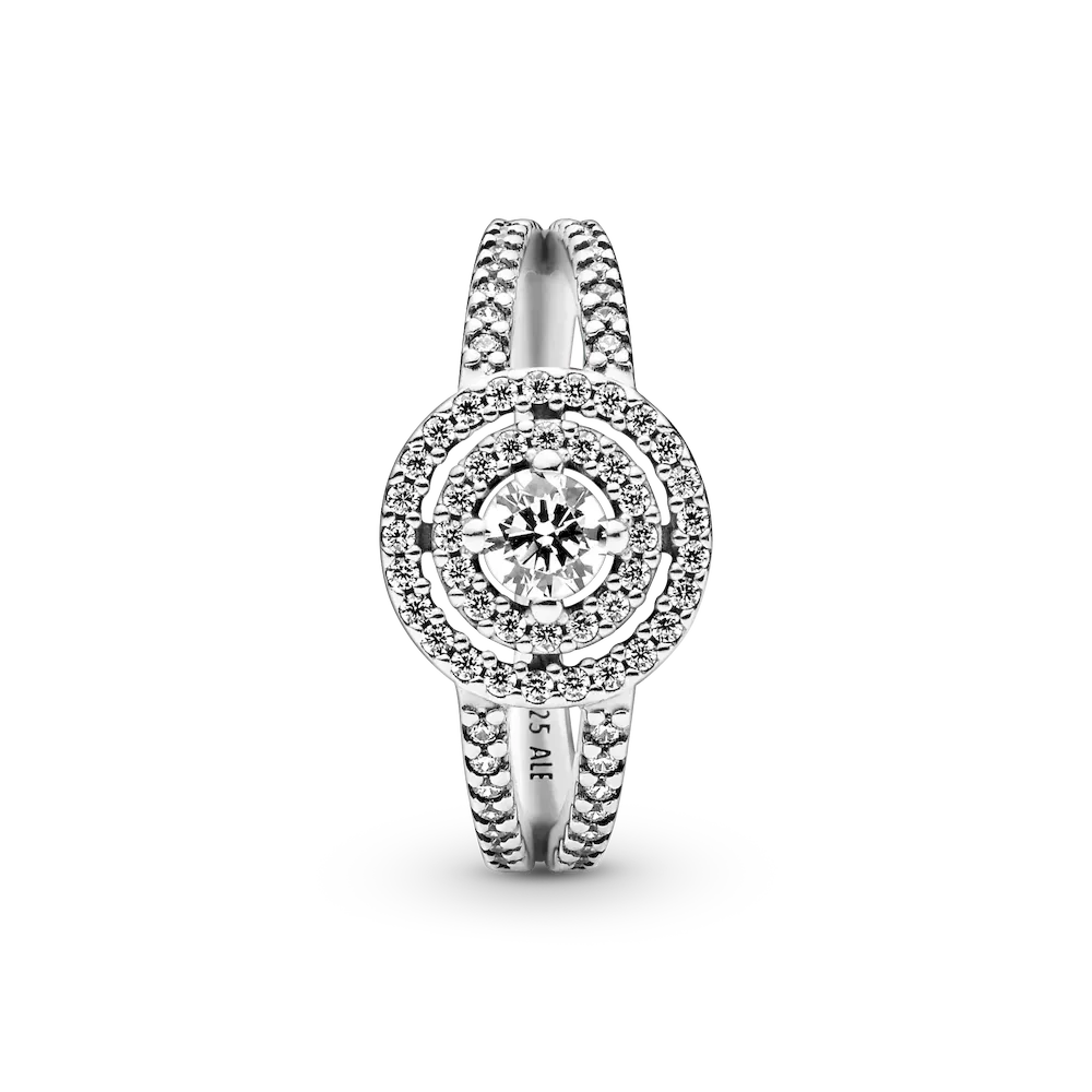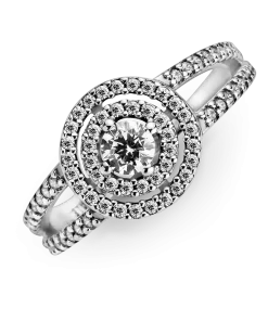 Give the gift of classic style with the Sparkling Double Halo Ring. Hand-finished in sterling silver, this shimmering piece is decorated with clear cubic zirconia. The statement centerpiece features one big, raised central stone surrounded by two sparkling halos. The outer halo sits slightly lower than the inner halo, with space in between them to add depth to the design. Treat your loved one to this ring and matching earrings for an eye-catching combination.