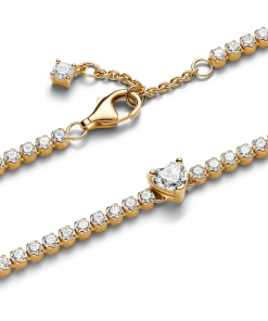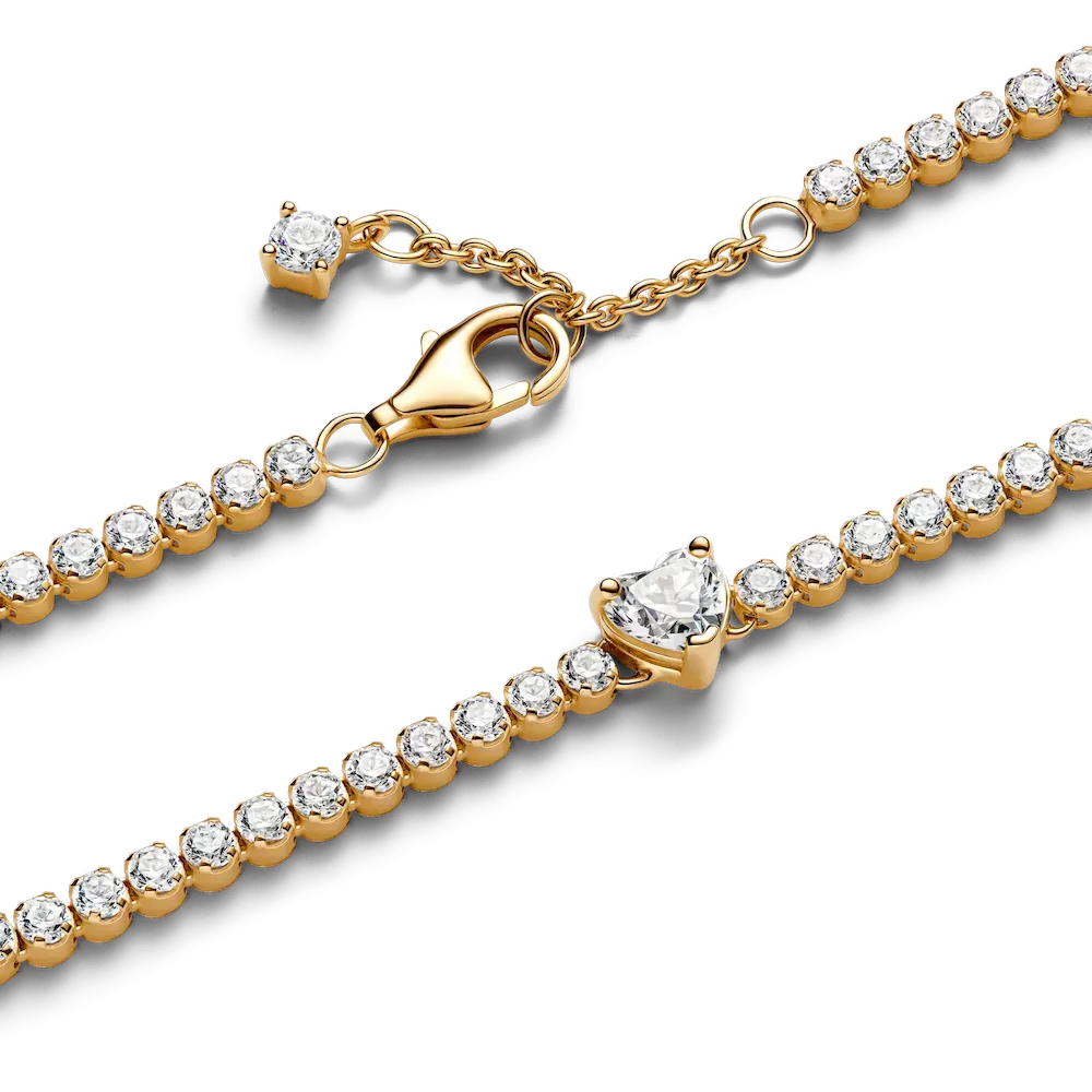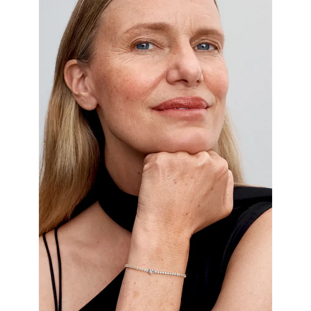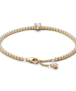 A sparkle that starts from the heart. This 14k gold-plated bracelet keeps love at the center of everything, with a heart-shaped stone, prong-set in the middle of a tennis bracelet surrounding. The rest of the bracelet shines with 58 bead-set cubic zirconia, finished with a lobster clasp closure. Give this special piece to the one in your life who just loves love (yourself included).