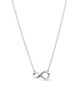 Wear the ultimate symbol of eternal love, the infinity symbol close to your heart with this necklace. A curved design means the infinity symbol rises in the center, creating an eye-catching three-dimensional look while the slider clasp of the collier necklace allows you to adjust the length to suit your style. Crafted in sterling silver and featuring seven bead-set round brilliant-cut clear cubic zirconia, this is a subtle design and delicate form with unique deeper detailing.