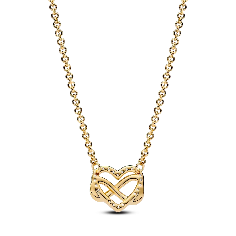 Plated with 14k gold, the Sparkling Infinity Heart Collier Necklace is a versatile piece perfect for special occasions as well as everyday wear. The openwork heart pendant, adorned with 22 brilliant-cut cubic zirconia stones, delicately frames an asymmetric infinity symbol. As a symbol of eternal love, the necklace features an adjustable chain with three jump rings, allowing you to customize its length. Inspired by the profound bonds we share, this piece is a testament to the infinite depth of love and makes for a great gift.