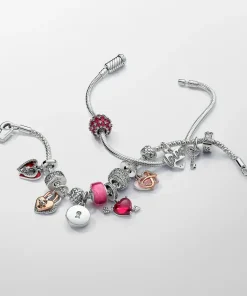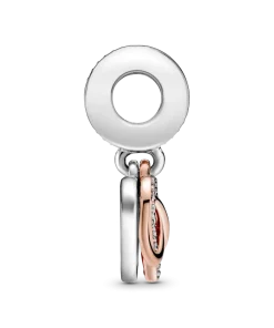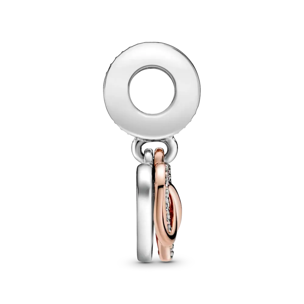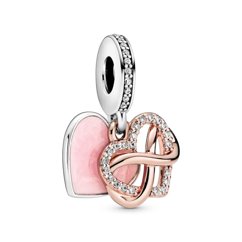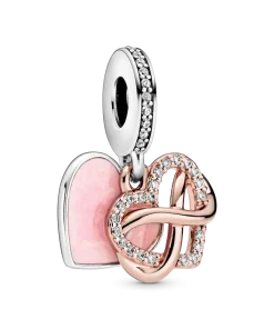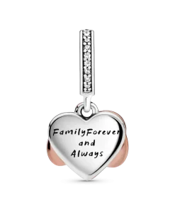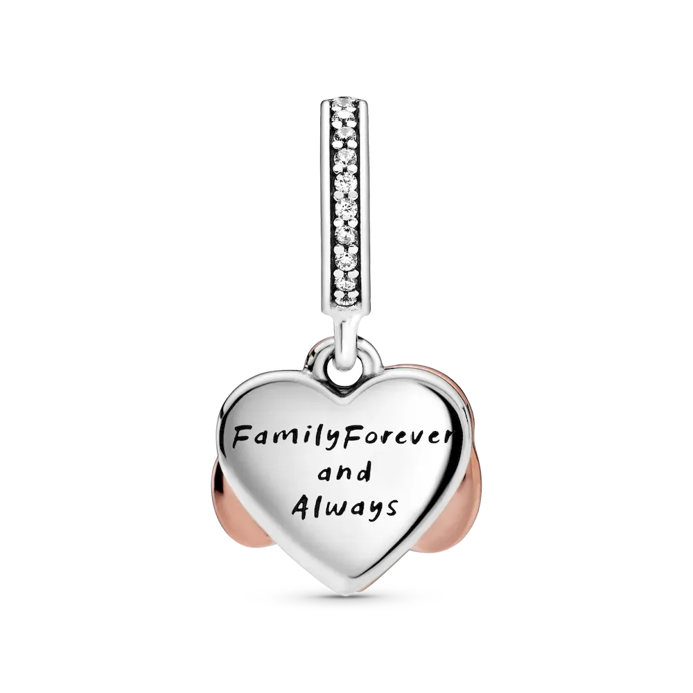 Take your love to infinity and beyond with this Sparkling Infinity Heart Dangle Charm. The front dangle is hand-finished in 14k rose gold plating, and features an infinity sign wrapped around a sparkling heart set with clear cubic zirconia. The back dangle’s pink hand-applied enamel provides a sweet backdrop to the love-filled message of the dangle charm with the engraving “Family forever and always”.