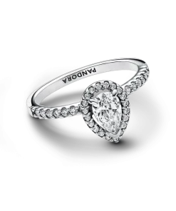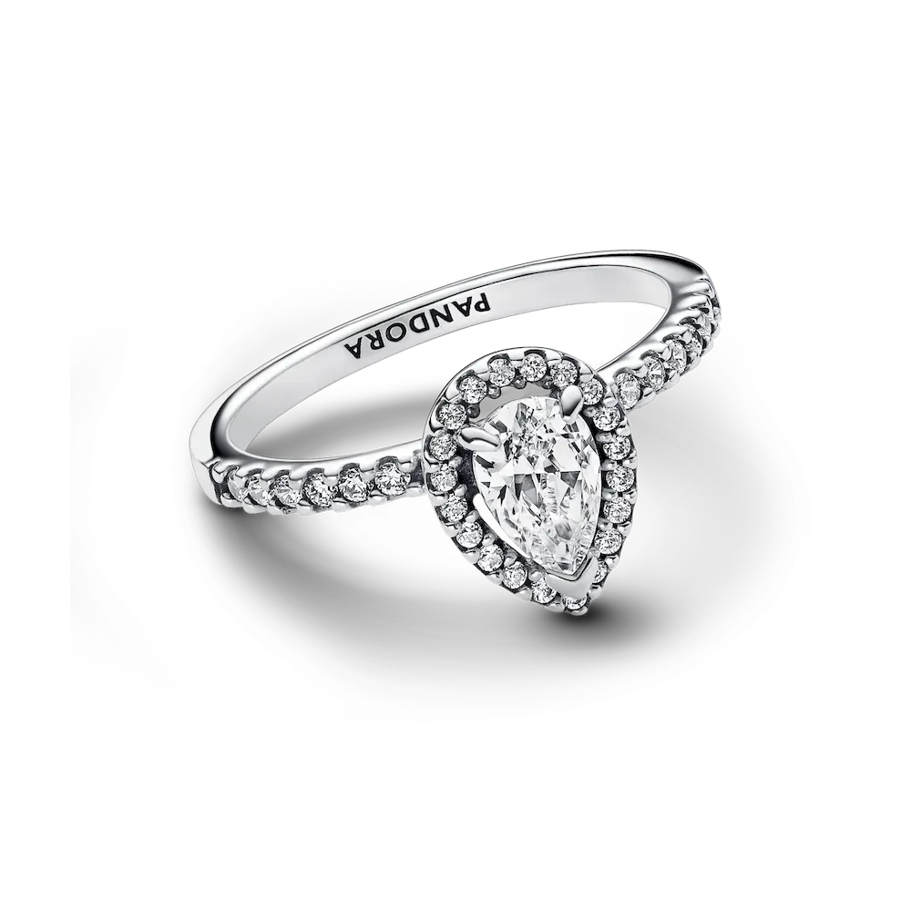 Shine brighter than ever when you wear the Sparkling Pear Halo Ring. This sterling silver ring features one striking pear-shaped stone set slightly above a delicate pavé halo. A V-shaped prong and two claw prongs hold the center stone in place. The band is smooth and polished on the bottom half and set with pavé on the upper half. A reimagined classic with ample sparkle and dimension, this shining ring makes a glamorous statement however it’s worn.