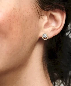 Make an elegant statement with the Sparkling Round Halo Stud Earrings. Hand-finished with 14k gold plating, it features solitaire stones in an off-centered setting surrounded by a circle of pavé. The placement of the stones creates a unique silhouette and gives these earrings a more modern look.